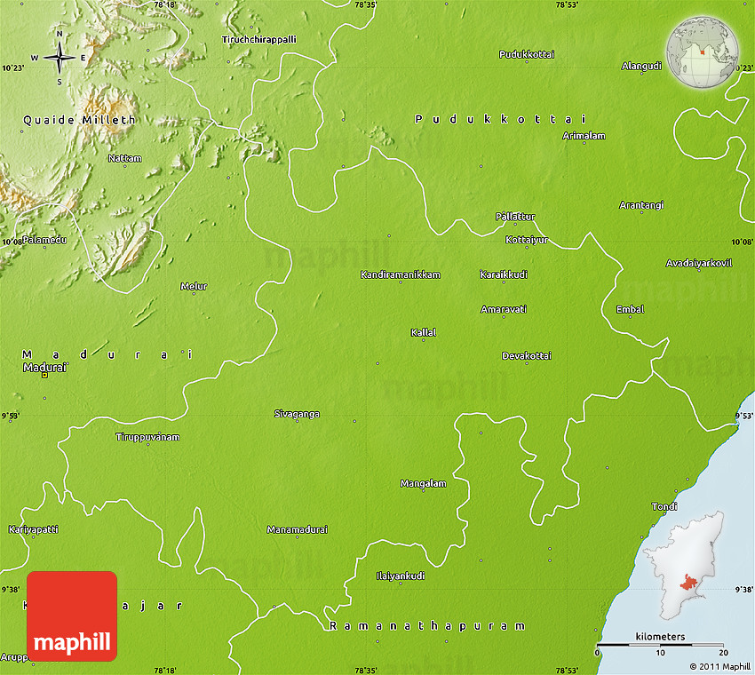 Physical map illustrates the mountains, lowlands, oceans, lakes and rivers and other physical landscape features of Pasumpon Muthuramalingam. Differences in land elevations relative to the sea level are represented by color.