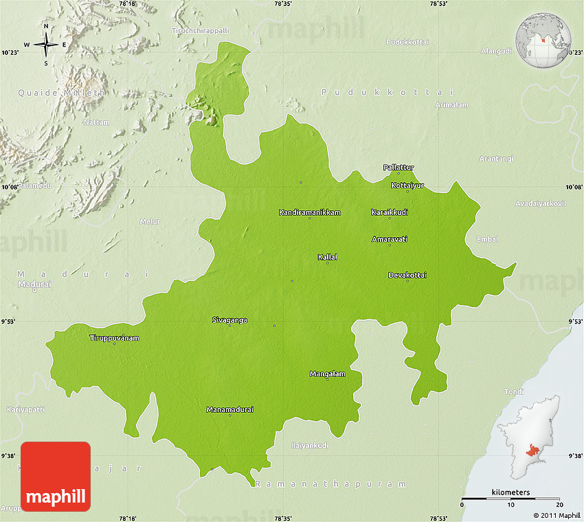 Maphill is a collection of map images. This physical map of Pasumpon Muthuramalingam is one of them. Click on the Detailed button under the image to switch to a more detailed map.