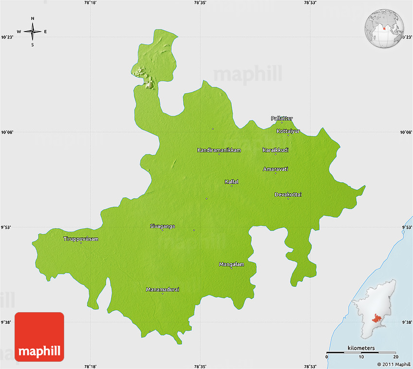 Physical map illustrates the mountains, lowlands, oceans, lakes and rivers and other physical landscape features of Pasumpon Muthuramalingam. Differences in land elevations relative to the sea level are represented by color.