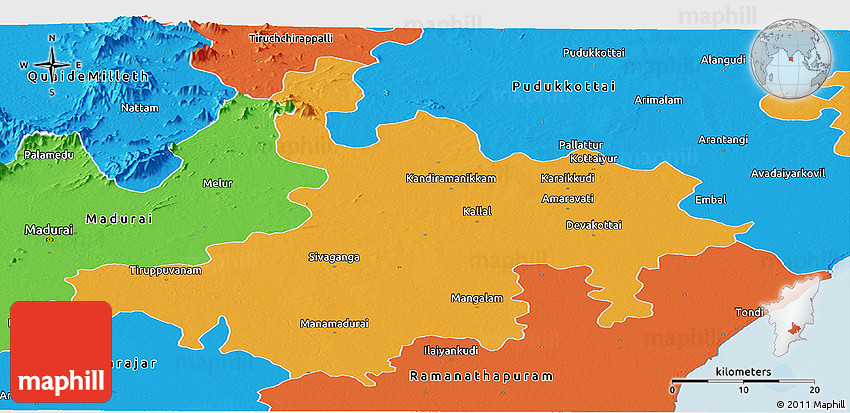 The panoramic political map represents one of several map types and styles available. Look at Pasumpon Muthuramalingam, Tamil Nadu, India from different perspectives.