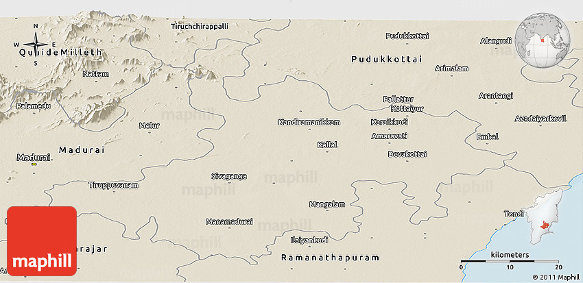 Shaded relief map shows landscape features, such as mountains, valleys and plateaus. Flat areas are smooth on the map, areas with steep slopes and mountains appear more rough. The above map of Pasumpon Muthuramalingam was created using a digital elevation model.