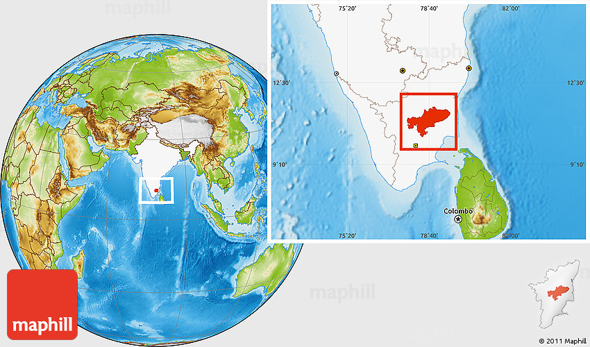 Maphill is a collection of map images. This image combines a physical map with the globe centered on Tiruchchirappalli. Use the buttons under the image to switch to different map types.