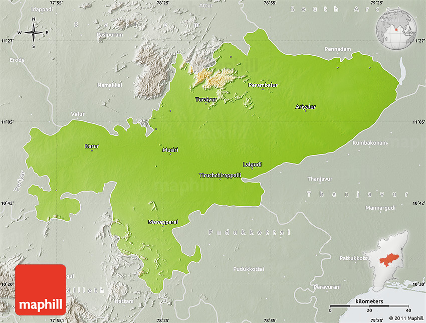 The flat physical map represents one of several map types and styles available. Look at Tiruchchirappalli, Tamil Nadu, India from different perspectives.