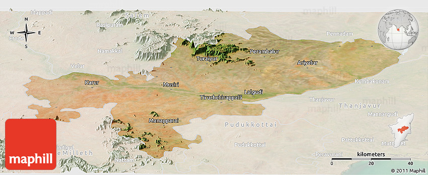 Each map type offers different information and each map style is designed for a different purpose. Read about the styles and map projection used in the above map (Satellite Panoramic Map of Tiruchchirappalli, lighten).