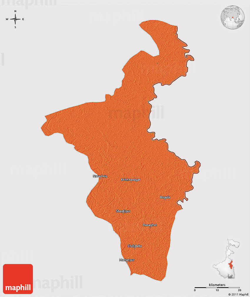 The 3D political map represents one of several map types and styles available. Look at Nadia (Krishnanagar), West Bengal, India from different perspectives.
