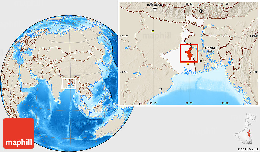Maphill is a collection of map images. This image combines a shaded relief map with the globe centered on Nadia (Krishnanagar). Use the buttons under the image to switch to different map types.