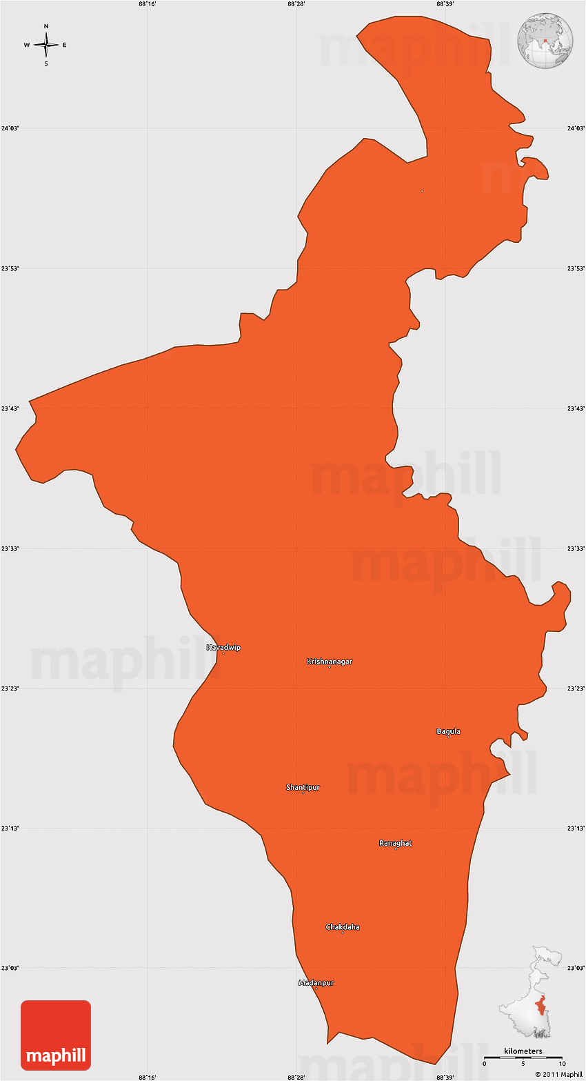 Maphill is a collection of map graphics. This simple outline map of Nadia (Krishnanagar) is one of these images. Use the buttons under the image to switch to more comprehensive and detailed map types.
