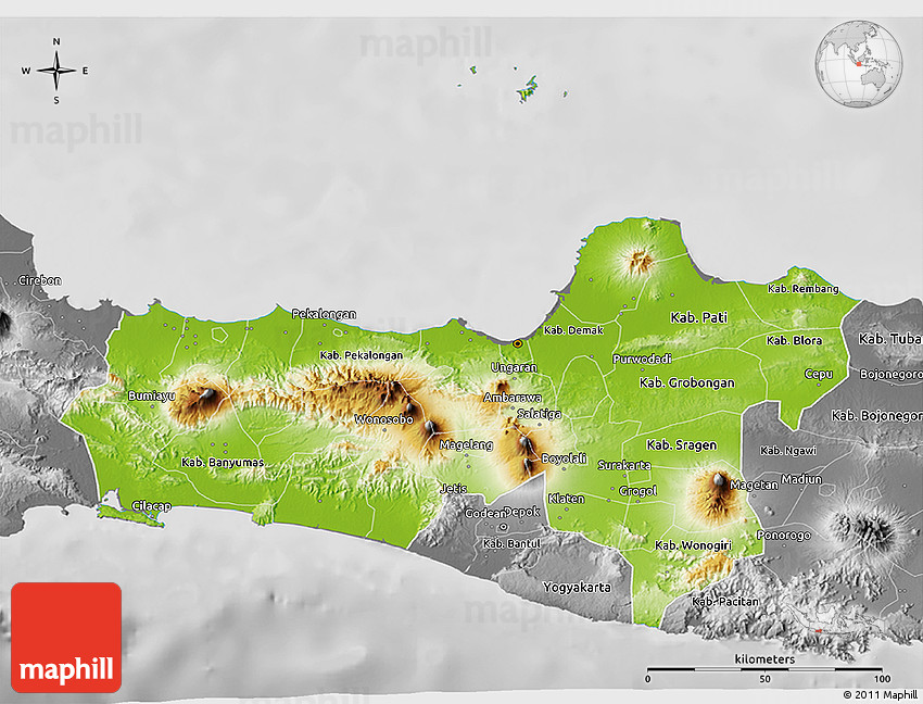 Physical map illustrates the mountains, lowlands, oceans, lakes and rivers and other physical landscape features of Central Java. Differences in land elevations relative to the sea level are represented by color.