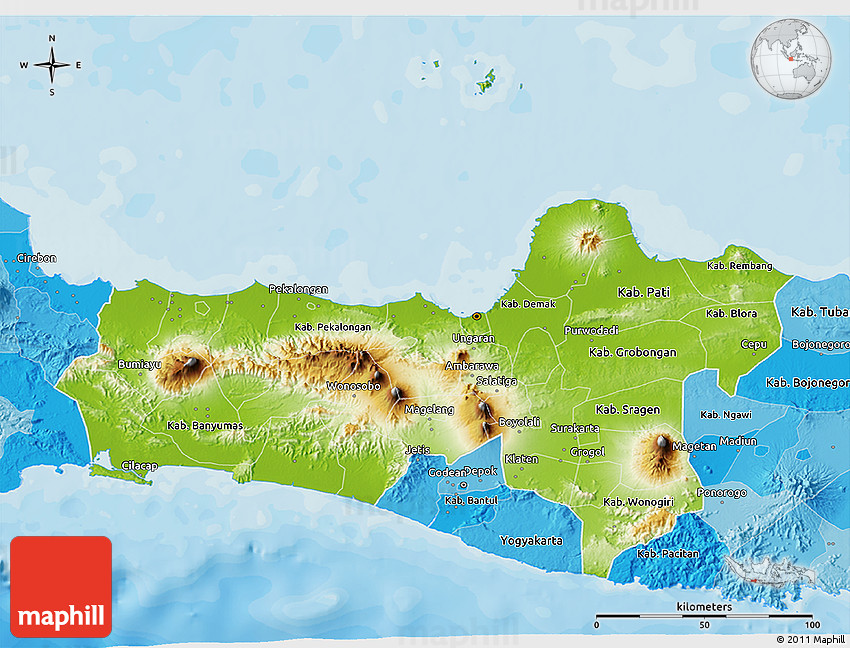 Physical map illustrates the mountains, lowlands, oceans, lakes and rivers and other physical landscape features of Central Java. Differences in land elevations relative to the sea level are represented by color.