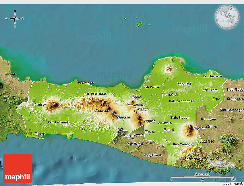 Physical map illustrates the mountains, lowlands, oceans, lakes and rivers and other physical landscape features of Central Java. Differences in land elevations relative to the sea level are represented by color.