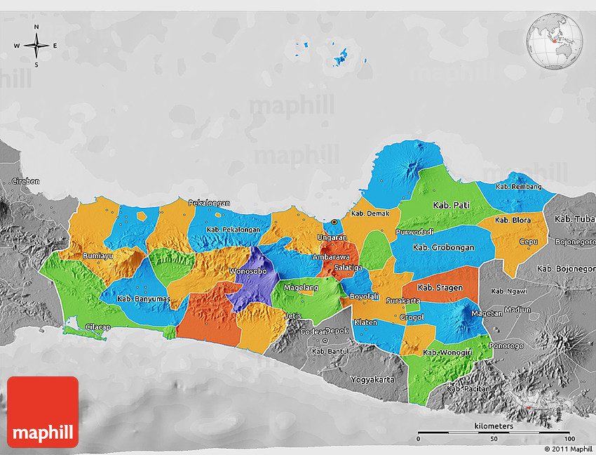 The 3D political map represents one of many map types and styles available. Look at Central Java from different perspectives.