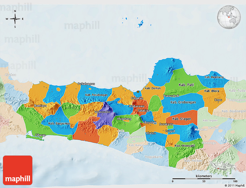 The 3D political map represents one of many map types and styles available. Look at Central Java from different perspectives.
