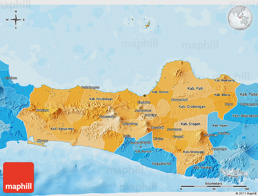 The 3D political shades map represents one of many map types and styles available. Look at Central Java from different perspectives.