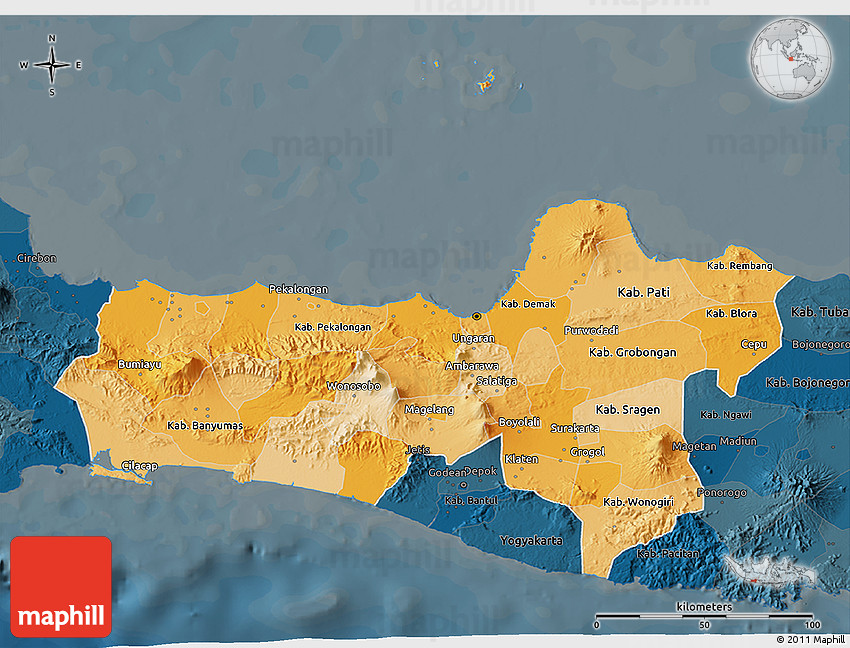 The 3D political shades map represents one of many map types and styles available. Look at Central Java from different perspectives.