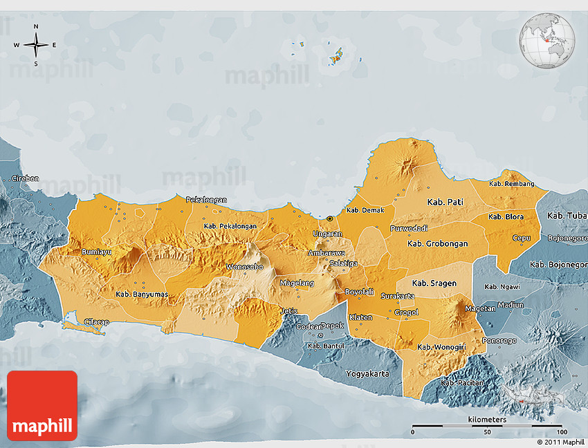 The 3D political shades map represents one of many map types and styles available. Look at Central Java from different perspectives.