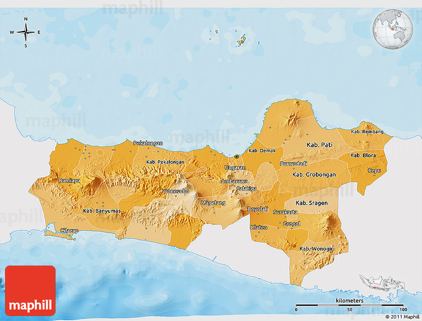 The 3D political shades map represents one of many map types and styles available. Look at Central Java from different perspectives.