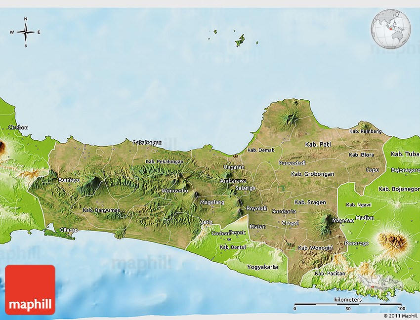 Physical map illustrates the mountains, lowlands, oceans, lakes and rivers and other physical landscape features of Central Java. Differences in land elevations relative to the sea level are represented by color.