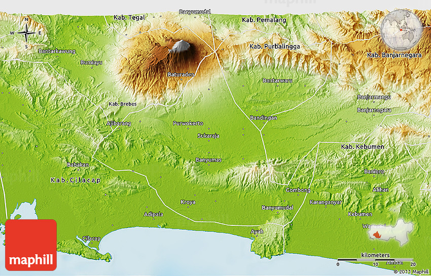 Physical map illustrates the mountains, lowlands, oceans, lakes and rivers and other physical landscape features of Kab. Banyumas. Differences in land elevations relative to the sea level are represented by color.