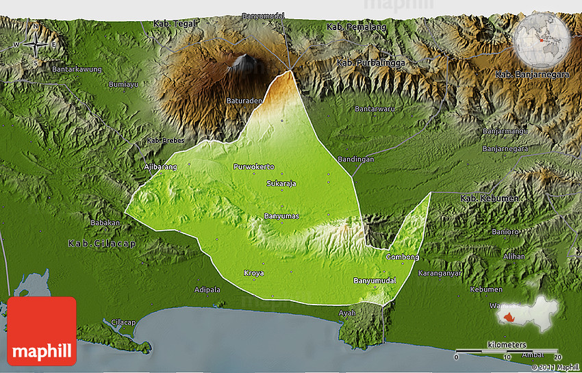 Physical map illustrates the mountains, lowlands, oceans, lakes and rivers and other physical landscape features of Kab. Banyumas. Differences in land elevations relative to the sea level are represented by color.