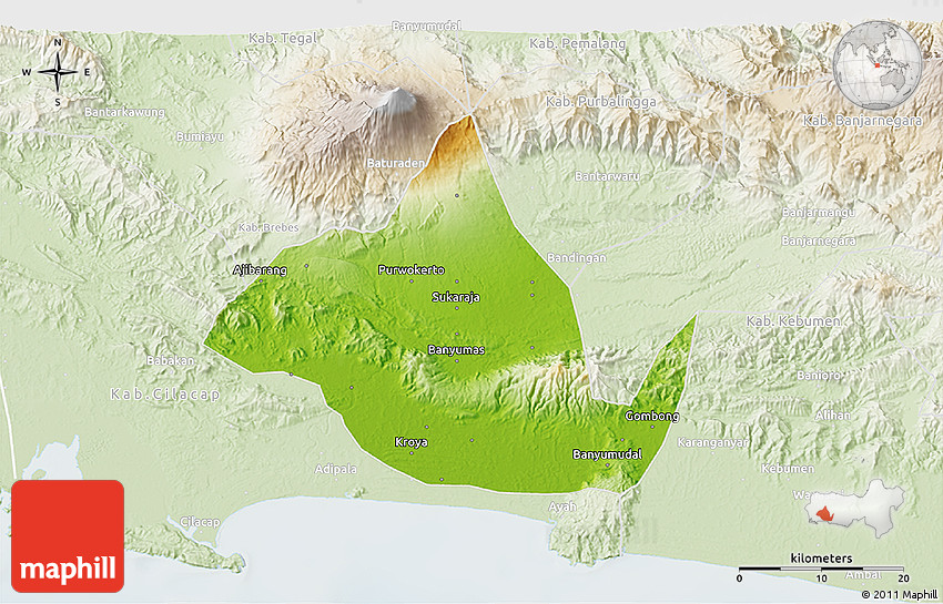 Physical map illustrates the mountains, lowlands, oceans, lakes and rivers and other physical landscape features of Kab. Banyumas. Differences in land elevations relative to the sea level are represented by color.