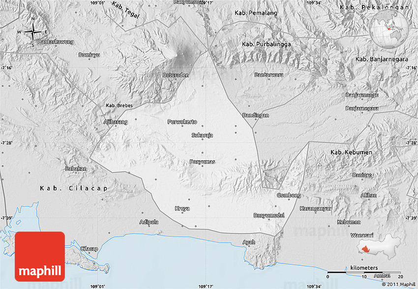 The flat silver style map represents one of several map types and styles available. Look at Kab. Banyumas, Central Java, Indonesia from different perspectives.
