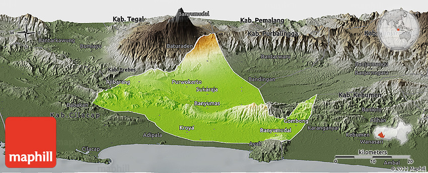 The panoramic physical map represents one of several map types and styles available. Look at Kab. Banyumas, Central Java, Indonesia from different perspectives.