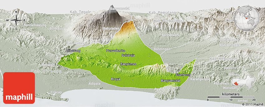 The panoramic physical map represents one of several map types and styles available. Look at Kab. Banyumas, Central Java, Indonesia from different perspectives.