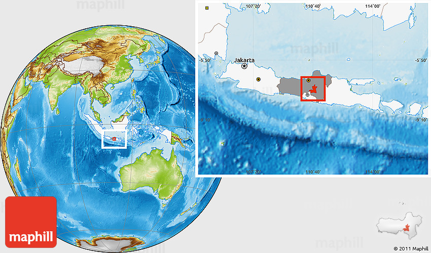 Maphill is a collection of map images. This image combines a physical map with the globe centered on Kab. Boyolali. Use the buttons under the image to switch to different map types.