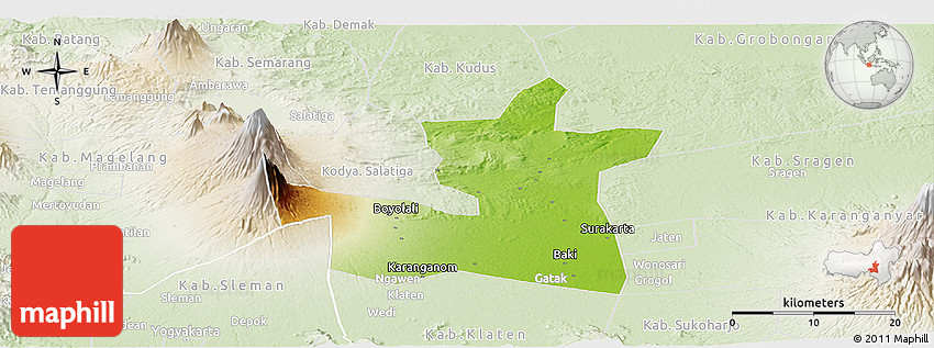 The panoramic physical map represents one of several map types and styles available. Look at Kab. Boyolali, Central Java, Indonesia from different perspectives.
