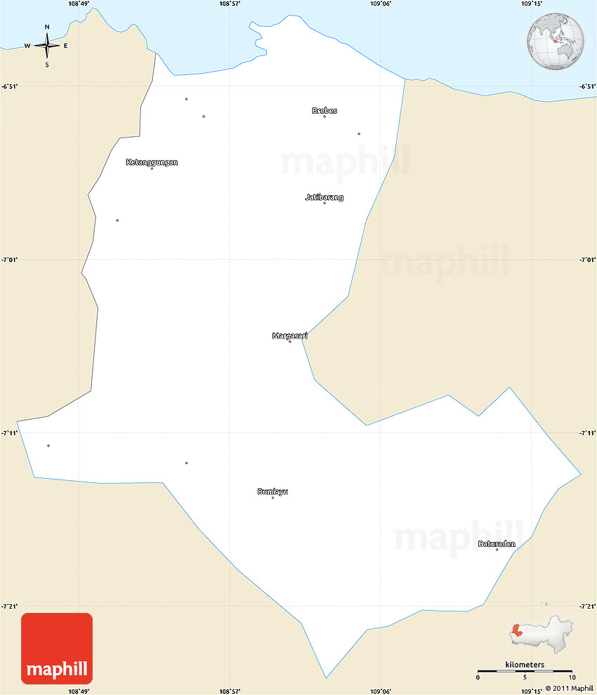 Maphill is a collection of map graphics. This simple outline map of Kab. Brebes is one of these images. Use the buttons under the image to switch to more comprehensive and detailed map types.