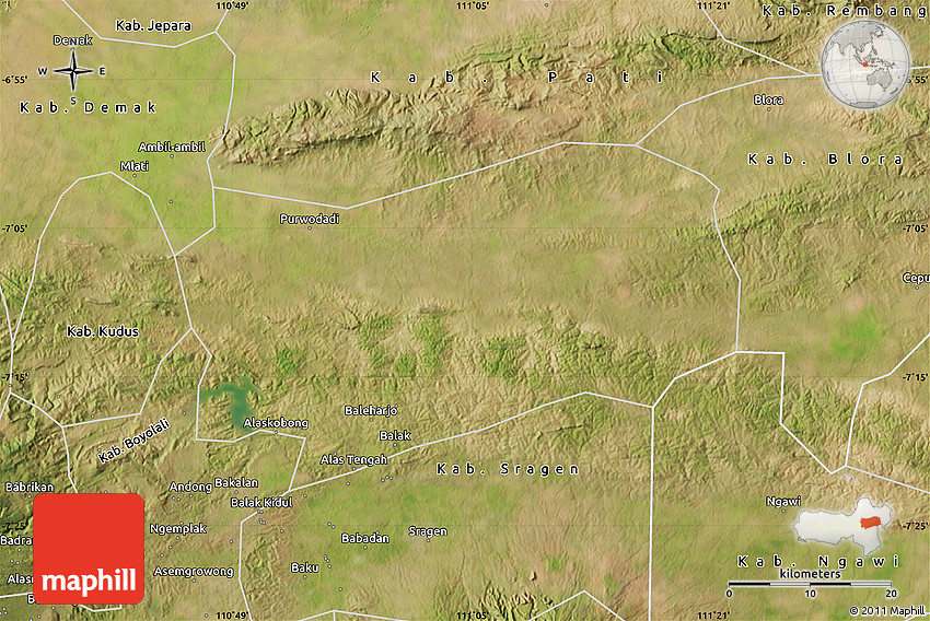 The flat satellite map represents one of several map types and styles available. Look at Kab. Grobongan, Central Java, Indonesia from different perspectives.