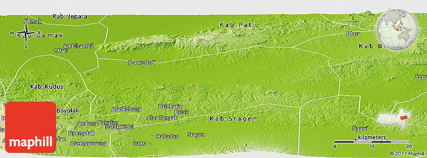 Physical map illustrates the mountains, lowlands, oceans, lakes and rivers and other physical landscape features of Kab. Grobongan. Differences in land elevations relative to the sea level are represented by color.