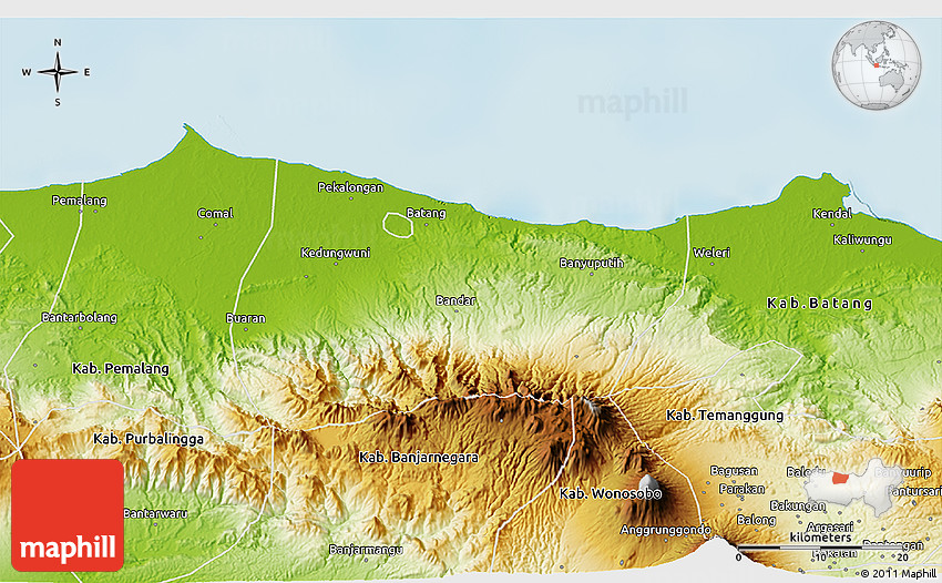 Physical map illustrates the mountains, lowlands, oceans, lakes and rivers and other physical landscape features of Kab. Pekalongan. Differences in land elevations relative to the sea level are represented by color.