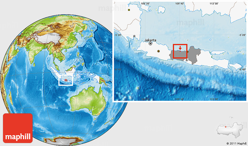 Maphill is a collection of map images. This image combines a physical map with the globe centered on Kodya. Pekalongan. Use the buttons under the image to switch to different map types.