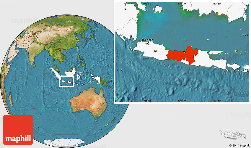 Maphill is a collection of map images. This image combines a satellite map with the globe centered on Central Java. Use the buttons under the image to switch to different map types.