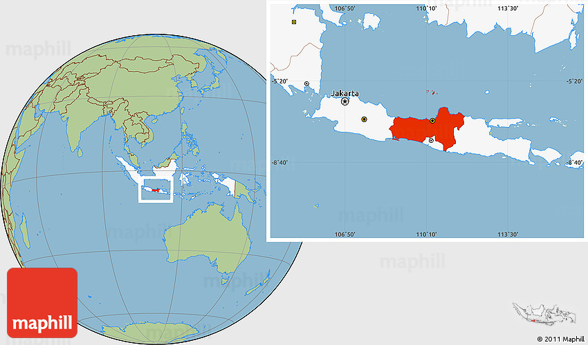 The location map of Central Java combines two projections: the orthographic azimuthal projection for the globe and the simple geographic projection for the rectangular part of the map. Geographic projection has straight meridians and parallels, each degree of latitude and longitude is the same size over the entire world map.