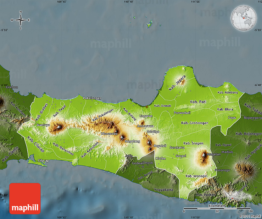 Embed the above physical map of Central Java into your website. Enrich your blog with quality map graphics. Make the web a more beautiful place.