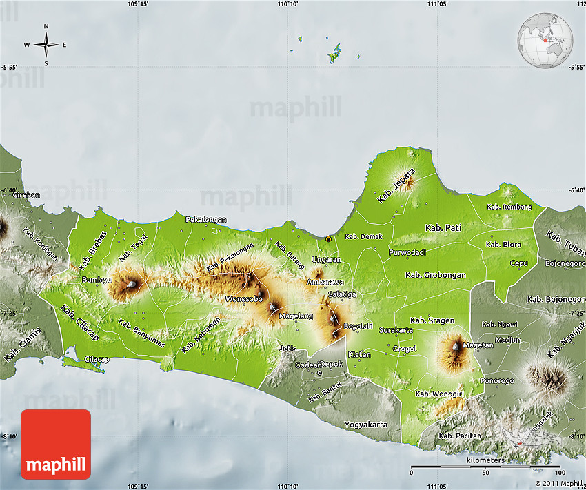 Physical map illustrates the mountains, lowlands, oceans, lakes and rivers and other physical landscape features of Central Java. Differences in land elevations relative to the sea level are represented by color.