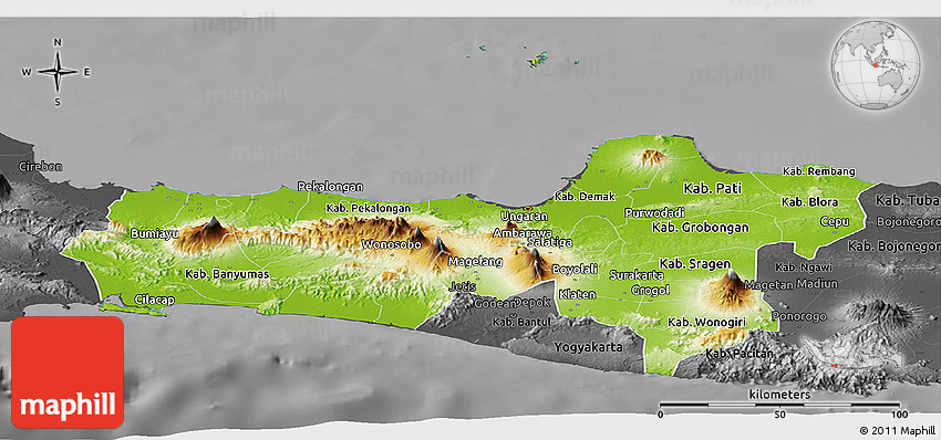 The panoramic physical map represents one of many map types and styles available. Look at Central Java from different perspectives.