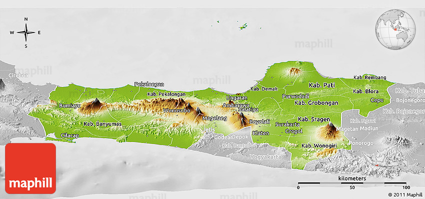The panoramic physical map represents one of many map types and styles available. Look at Central Java from different perspectives.