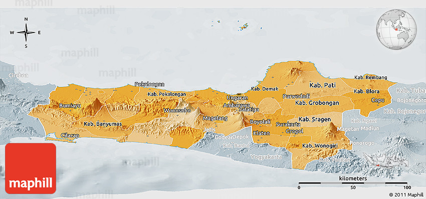Embed the above political shades panoramic map of Central Java into your website. Enrich your blog with quality map graphics. Make the web a more beautiful place.