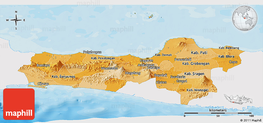 Embed the above political shades panoramic map of Central Java into your website. Enrich your blog with quality map graphics. Make the web a more beautiful place.