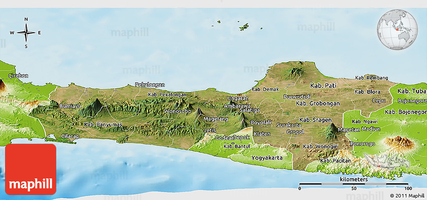 Each map type offers different information and each map style is designed for a different purpose. Read about the styles and map projection used in the above map (Satellite Panoramic Map of Central Java, physical outside).