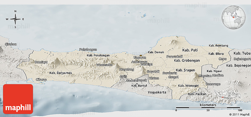 The value of Maphill lies in the possibility to look at the same area from several perspectives. Maphill presents the map of Central Java in a wide variety of map types and styles.