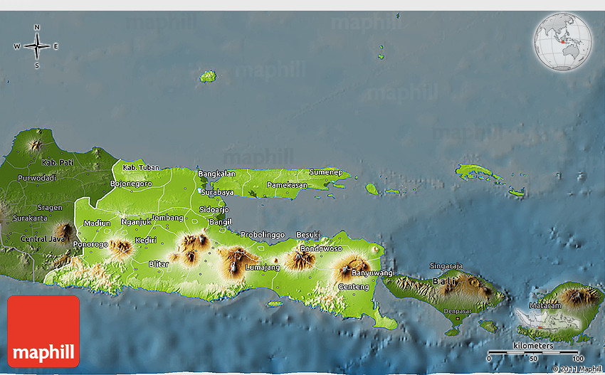Each map type offers different information and each map style is designed for a different purpose. Read about the styles and map projection used in the above map (Physical 3D Map of East Java, darken).