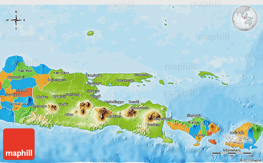Physical map illustrates the mountains, lowlands, oceans, lakes and rivers and other physical landscape features of East Java. Differences in land elevations relative to the sea level are represented by color.