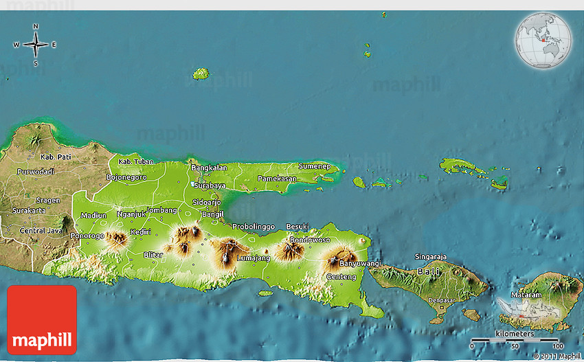 Physical map illustrates the mountains, lowlands, oceans, lakes and rivers and other physical landscape features of East Java. Differences in land elevations relative to the sea level are represented by color.