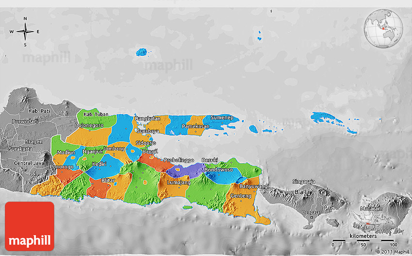The 3D political map represents one of many map types and styles available. Look at East Java from different perspectives.
