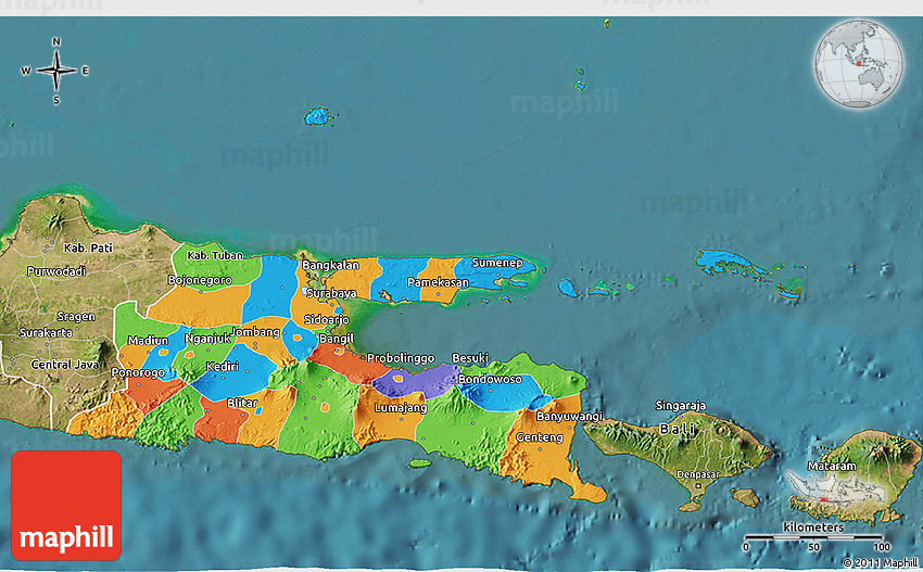 The 3D political map represents one of many map types and styles available. Look at East Java from different perspectives.