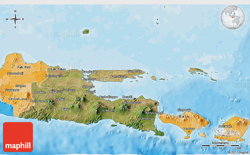Each map type offers different information and each map style is designed for a different purpose. Read about the styles and map projection used in the above map (Satellite 3D Map of East Java, political shades outside).